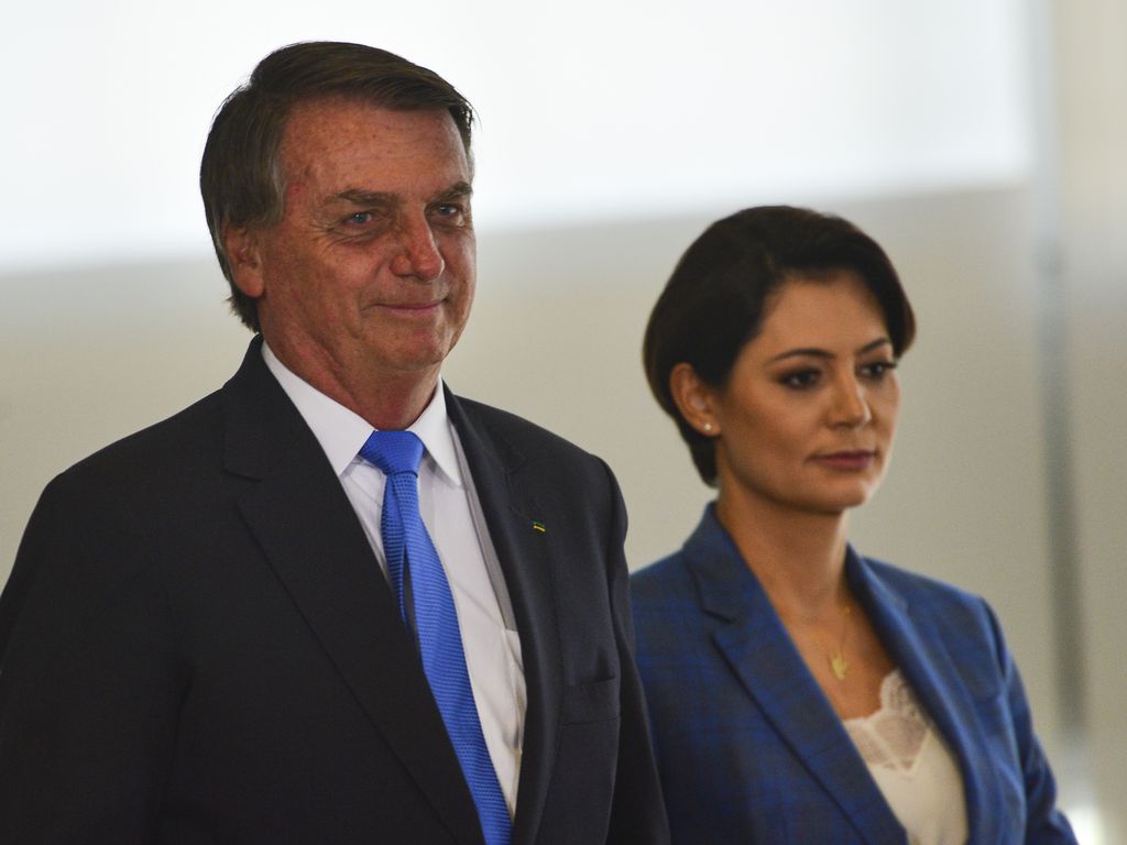 O presidente Jair Bolsonaro e a primeira-dama, Michelle Bolsonaro, participam do lançamento do Canal Educação e do Canal Libras, no Palácio do Planalto.