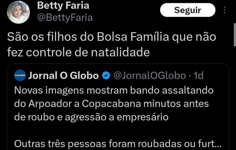 Tudo começou quando a atriz veterana resolveu dar sua opinião a respeito dos crimes: “São os filhos do Bolsa Família que não fez controle de natalidade”, escrever a artista ao compartilhar uma matéria do jornal O Globo sobre o alto índice de ataques no bairro da zona sul do Rio.