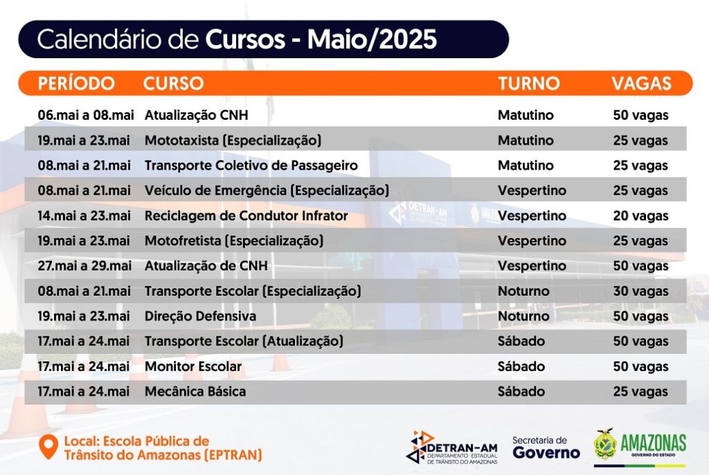 O Departamento Estadual de Trânsito do Amazonas (Detran-AM), por meio da Escola Pública de Trânsito (Eptran), está com inscrições abertas para cursos gratuitos que serão ministrados ao longo do mês de maio. Serão 420 vagas divididas nos turnos matutino, vespertino e noturno, e também aos sábados.