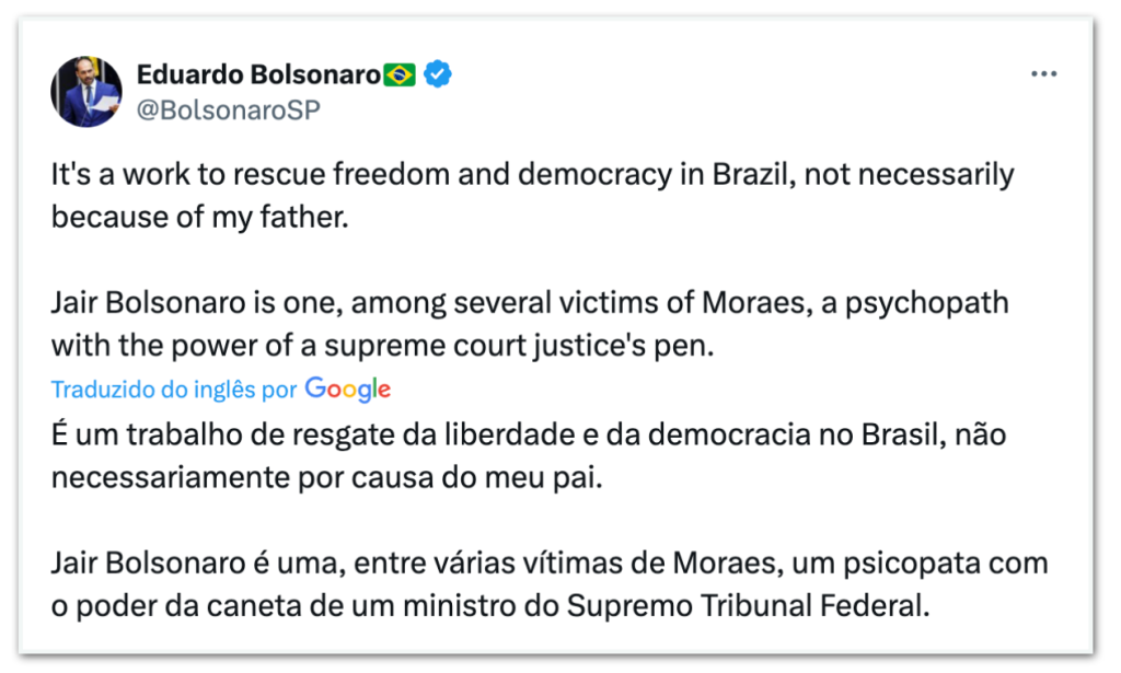 Eduardo deu a declaração no X (ex-Twitter) ao comentar sua entrevista ao Financial Times em que fala sobre novas sanções dos Estados Unidos contra autoridades brasileiras. “É um trabalho de resgate da liberdade e da democracia no Brasil, não necessariamente por causa do meu pai”, afirmou na publicação.