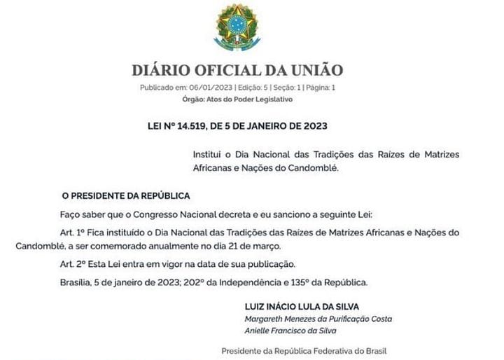 O presidente Luiz Inácio Lula da Silva, o Lula, sancioniu uma lei de autoria do deputado Vicentinho (PT), que institui o Dia Nacional das Tradições das Raízes de Matrizes Africanas e Nações do Candomblé.