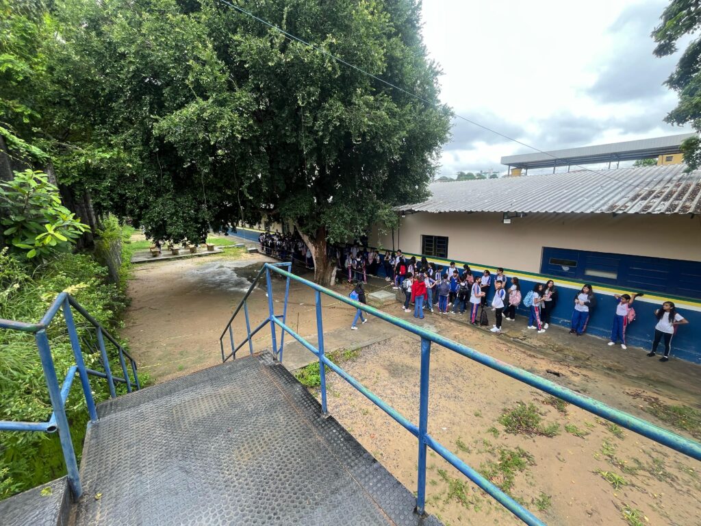 A rotina de chuva em Manaus tem exposto um problema antigo na Escola Estadual Getúlio Vargas, localizada na rua Marciano Armond, s/n, bairro Cachoeirinha, zona Sul da capital. Há 12 anos lecionando na unidade, o professor Erick Farias decidiu formalizar denúncia sobre a falta de cobertura e de passagem segura entre os blocos da escola. A situação que, segundo ele, coloca alunos em risco e compromete o acesso à merenda escolar.