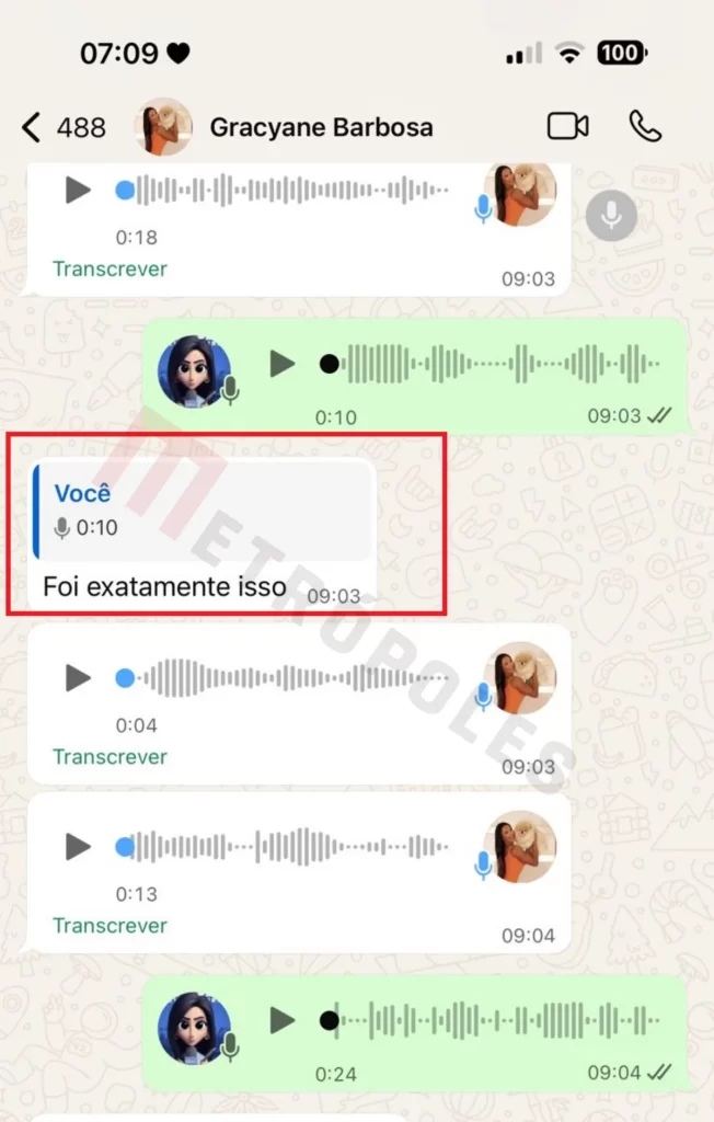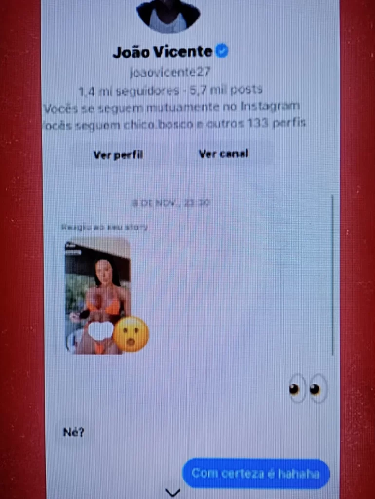 No X, antigo Twitter, os usuários se divertiram: “Ele negou, a Gracyanne negou disse que era outro João Vicente e agora os prints chegaram”, disse um. “Os bandidos que assaltaram a Gracyanne que devem estar vendendo os prints das conversas dela com o João Vicente”, analisou outra. “Chocante a informação que alguém tem tesão na barriga da Gracyanne Barbosa”, opinou um terceiro. “Que visão do inferno a Gracyanne Barbosa falando que quer ver o João Vicente andando de 4 pra ela 🤣🤣🤣. Daqui a pouco ela enfia o dedo no toba dele e pergunta ‘o que é que esse botãozinho faz?’ 🤣🤣🤣”, zoou mais um.
